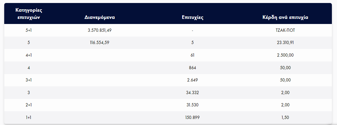 Στην πρώτη κατηγορία σημειώθηκε νέο τζακ ποτ, ενώ στη δεύτερη κατηγορία, πέντε τυχεροί κερδίζουν 23.310,91 ευρώ.