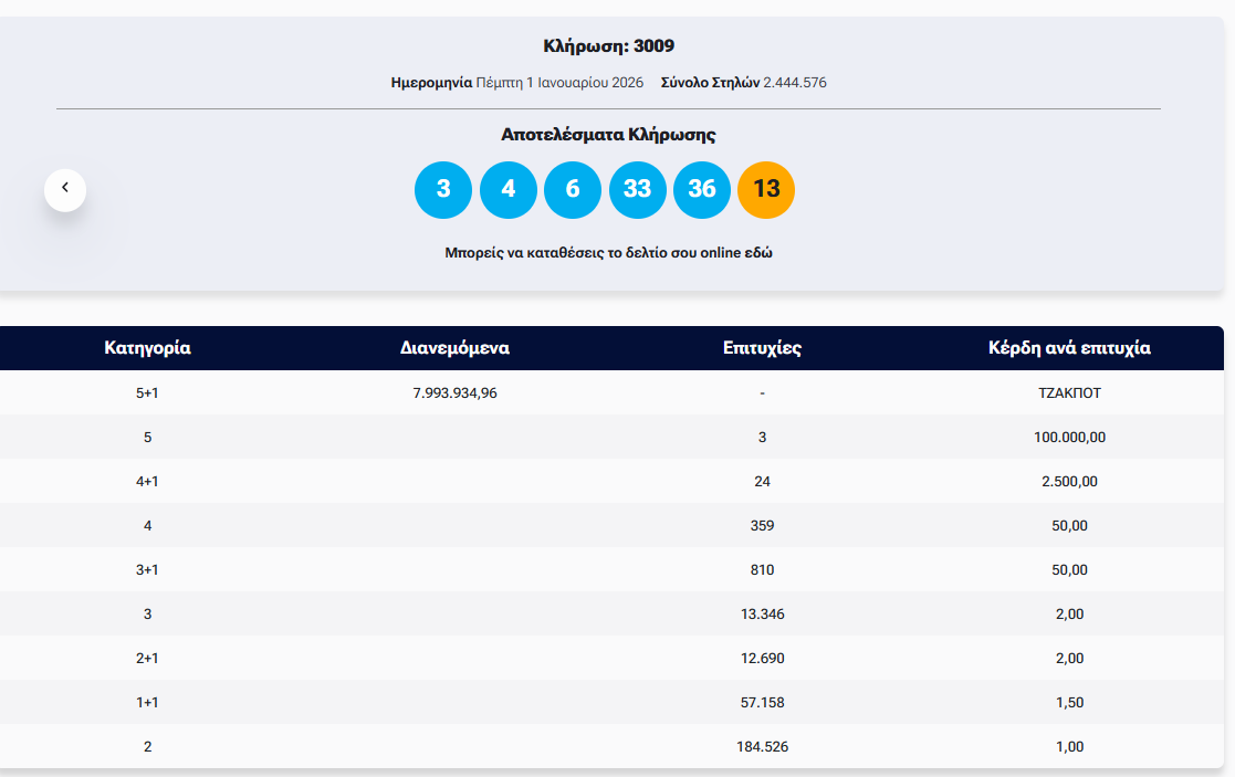 Οι τυχεροί αριθμοί στην κλήρωση τζόκερ σήμερα είναι: 3, 4, 6, 33, 36 και τζόκερ ο αριθμός 13.