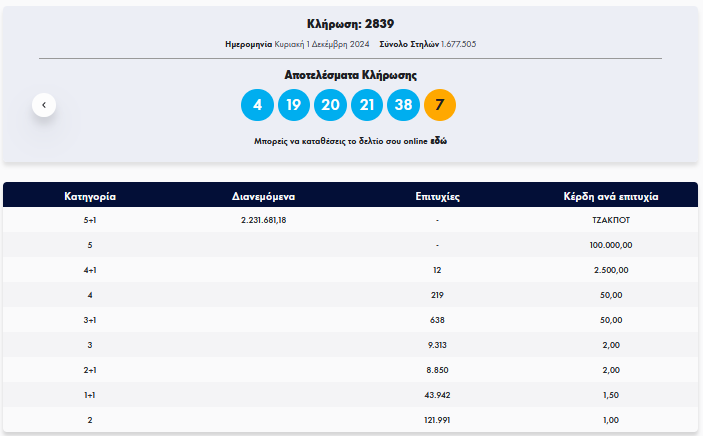Oλοκληρώθηκε η κλήρωση του Τζόκερ που πραγματοποιήθηκε την Κυριακή, 1 Δεκεμβρίου, με κέρδη πάνω από 2,1 εκατ. ευρώ.