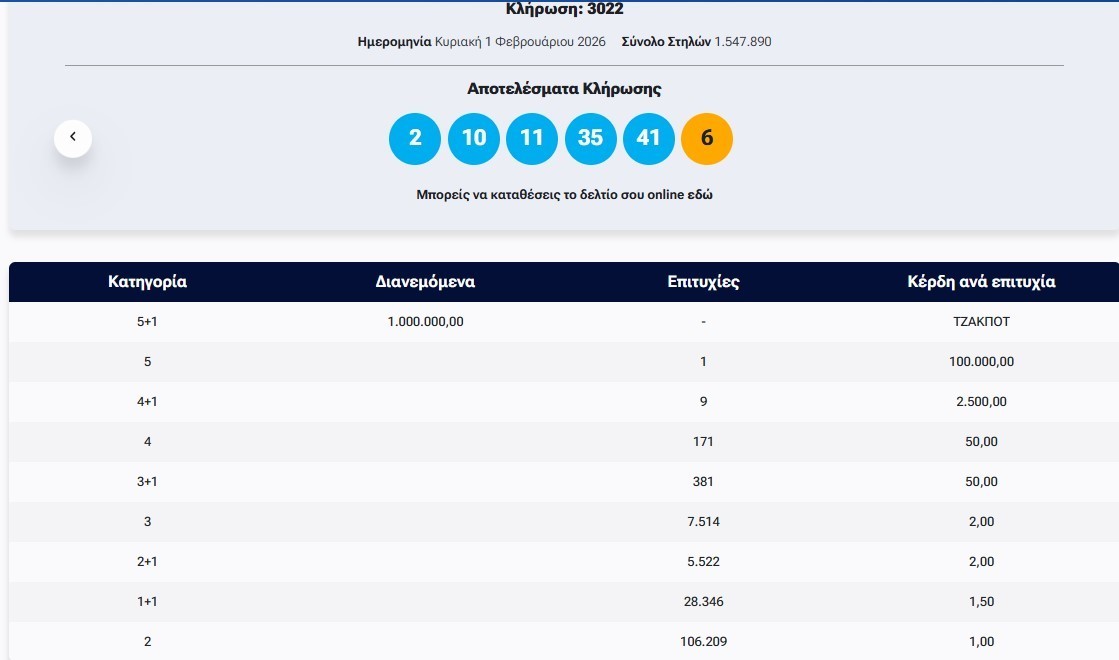 Ολοκληρώθηκε η κλήρωση του τζόκερ που πραγματοποιήθηκε σήμερα Κυριακή, 1 Φεβρουαρίου, με κέρδη πάνω από 1 εκατ. ευρώ.