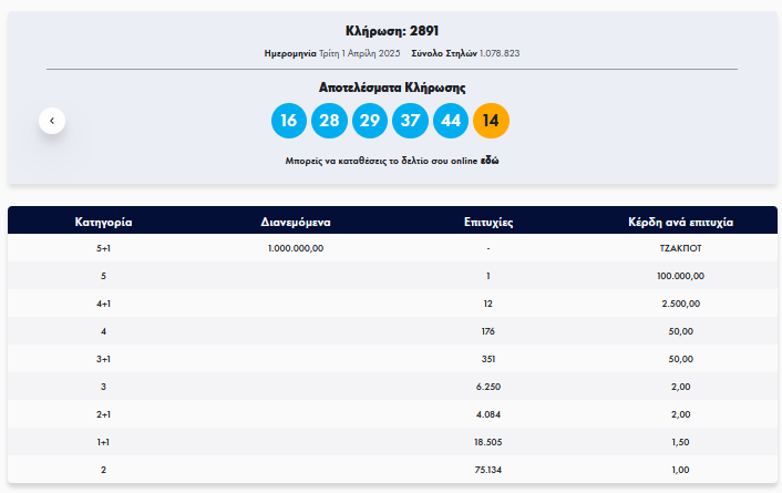 Oλοκληρώθηκε η κλήρωση του Τζόκερ που πραγματοποιήθηκε την Τρίτη, 1 Απριλίου, με κέρδη 1 εκατ. ευρώ.