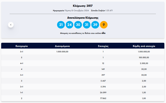 Oλοκληρώθηκε η κλήρωση του Τζόκερ που πραγματοποιήθηκε την Πέμπτη, 10 Οκτωβρίου, με κέρδη 1 εκατ. ευρώ.