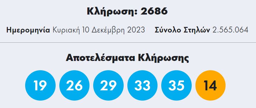 Oλοκληρώθηκε η κλήρωση 2686 του Τζόκερ που πραγματοποιήθηκε την Κυριακή 10 Δεκεμβρίου 2023, με κέρδη τουλάχιστον 1.200.000 ευρώ.