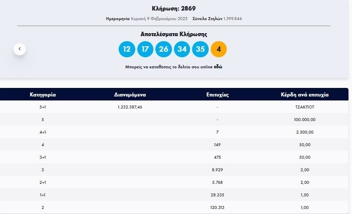 Oλοκληρώθηκε η κλήρωση του Τζόκερ που πραγματοποιήθηκε την Κυριακή, 10 Φεβρουαρίου, με κέρδη πάνω από 1 εκατ. ευρώ.