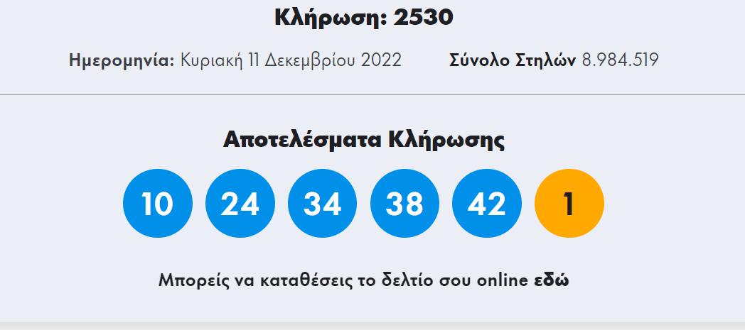 Οι τυχεροί αριθμοί στην κλήρωση που έγινε το βράδυ της Κυριακής 11/12/2022, είναι: 10, 24, 34, 38,42 και τζόκερ το 1.