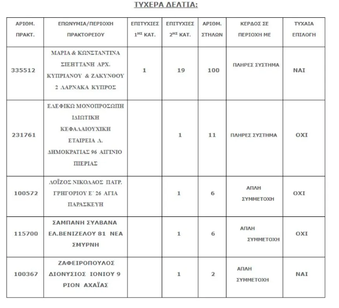Όπως ανακοίνωσε ο ΟΠΑΠ το τυχερό δελτίο συμπληρώθηκε στην Κύπρο και είχε συνολικά 100 στήλες.