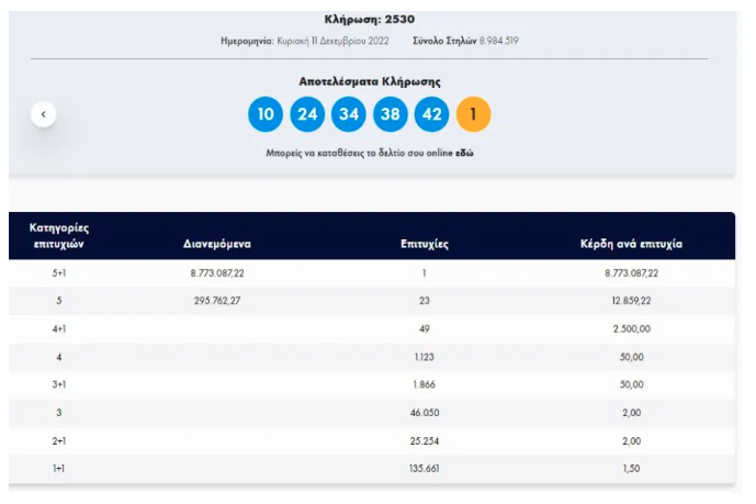 Υπενθυμίζεται ότι οι τυχεροί αριθμοί που έβγαλε η κληρωτίδα της Κυριακής ήταν οι: 10, 24, 34, 38, 42 και Τζόκερ ο αριθμός 1.