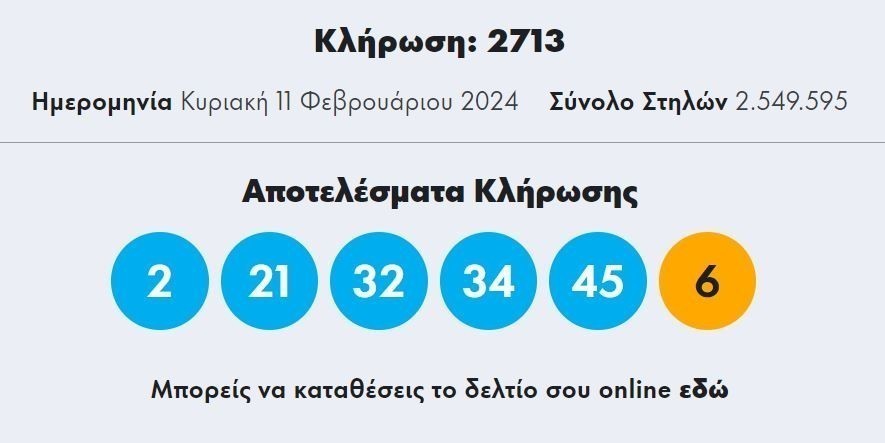 Oλοκληρώθηκε η κλήρωση 2713 του Τζόκερ που πραγματοποιήθηκε την Κυριακή 11 Φεβρουαρίου 2024, με κέρδη τουλάχιστον 3.300.000 ευρώ.