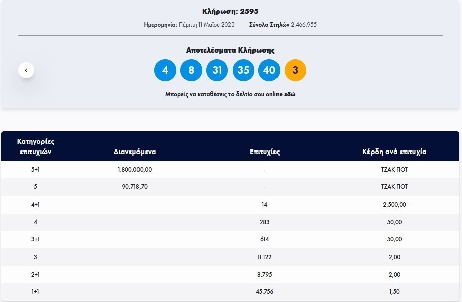 Oλοκληρώθηκε η κλήρωση του Τζόκερ που πραγματοποιήθηκε την Πέμπτη, 11 Μαϊου 2023 και μοίραζε €1.800.000 στους νικητές της πρώτης κατηγορίας.