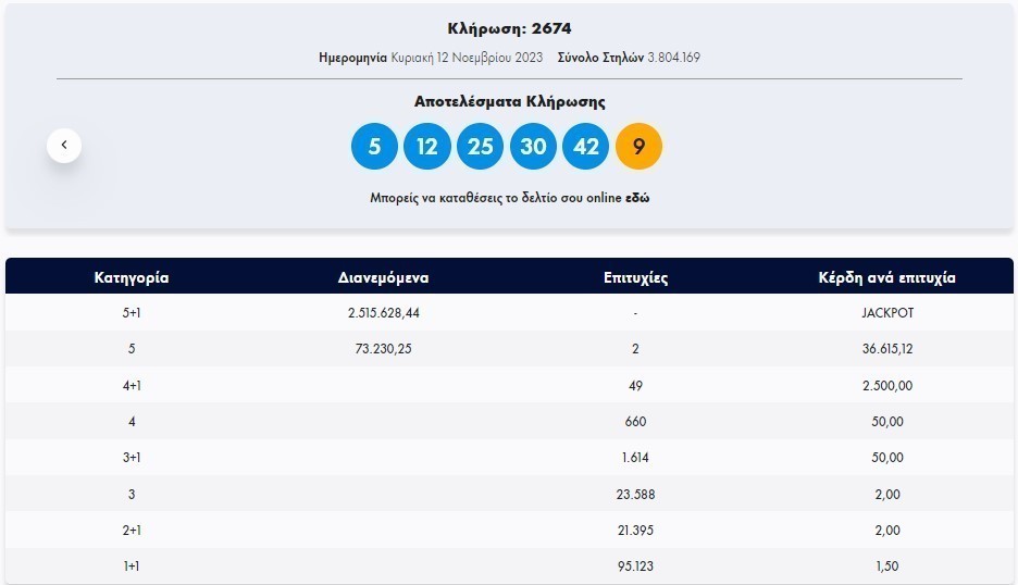 Oλοκληρώθηκε η κλήρωση του Τζόκερ που πραγματοποιήθηκε την Κυριακή, 12 Νοεμβρίου 2023, με κέρδη τουλάχιστον 2.500.000 ευρώ.