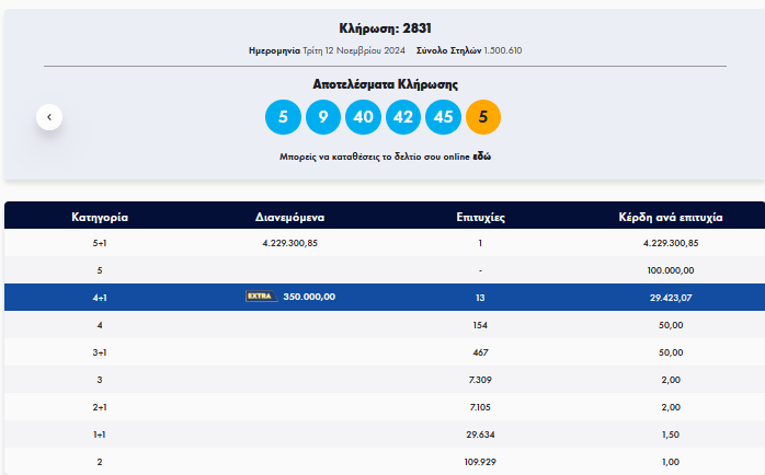 Oλοκληρώθηκε η κλήρωση του Τζόκερ που πραγματοποιήθηκε την Τρίτη, 12 Νοεμβρίου, με κέρδη πάνω από 4,2 εκατ. ευρώ.