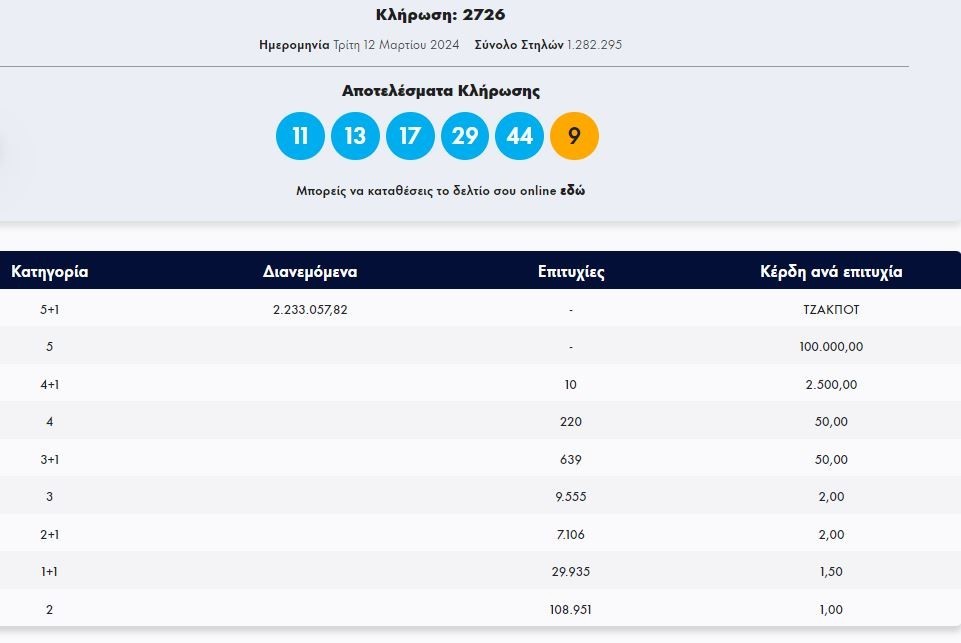 Οι τυχεροί αριθμοί στην κλήρωση Τζόκερ σήμερα είναι οι 29, 13, 44, 11, 17 και Τζόκερ ο αριθμός 9.