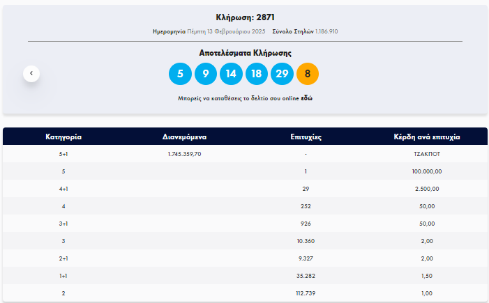 Oλοκληρώθηκε η κλήρωση του Τζόκερ που πραγματοποιήθηκε την Πέμπτη, 13 Φεβρουαρίου, με κέρδη πάνω από 1,7 εκατ. ευρώ.
