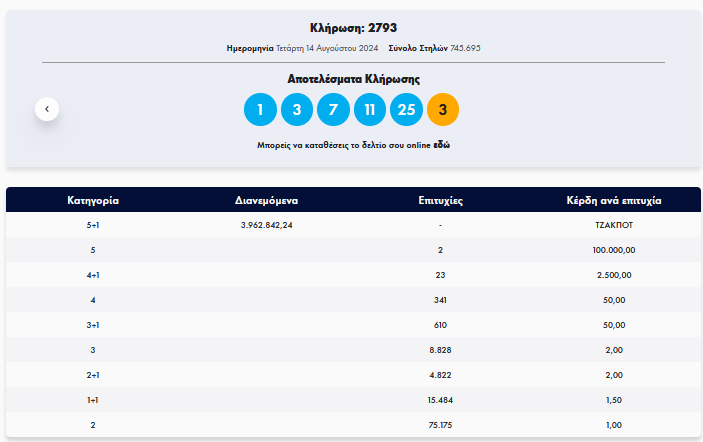 Oλοκληρώθηκε η κλήρωση του Τζόκερ που πραγματοποιήθηκε την Τετάρτη 14 Αυγούστου 2024, με κέρδη πάνω από 3,9 εκατ. ευρώ.
