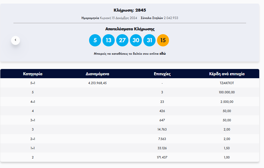 Oλοκληρώθηκε η κλήρωση του Τζόκερ που πραγματοποιήθηκε την Κυριακή, 15 Δεκεμβρίου, με κέρδη πάνω από 3,7 εκατ. ευρώ.
