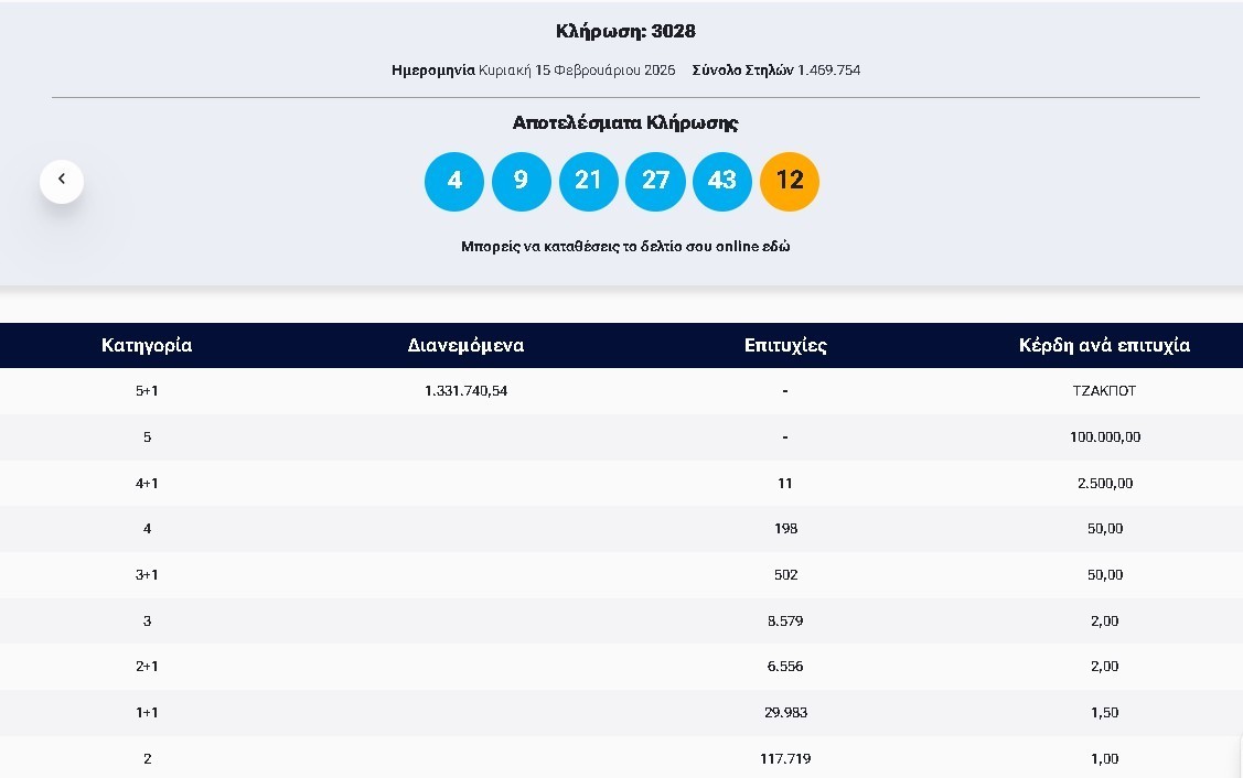Ολοκληρώθηκε η κλήρωση του τζόκερ που πραγματοποιήθηκε σήμερα Κυριακή, 15 Φεβρουαρίου, με κέρδη πάνω από 1,3 εκατ. ευρώ.