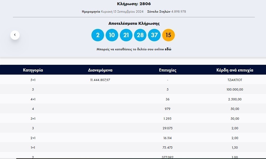 Οι τυχεροί αριθμοί στην κλήρωση Τζόκερ σήμερα είναι οι 2, 10, 21, 28, 37 και τζόκερ ο αριθμός 15.