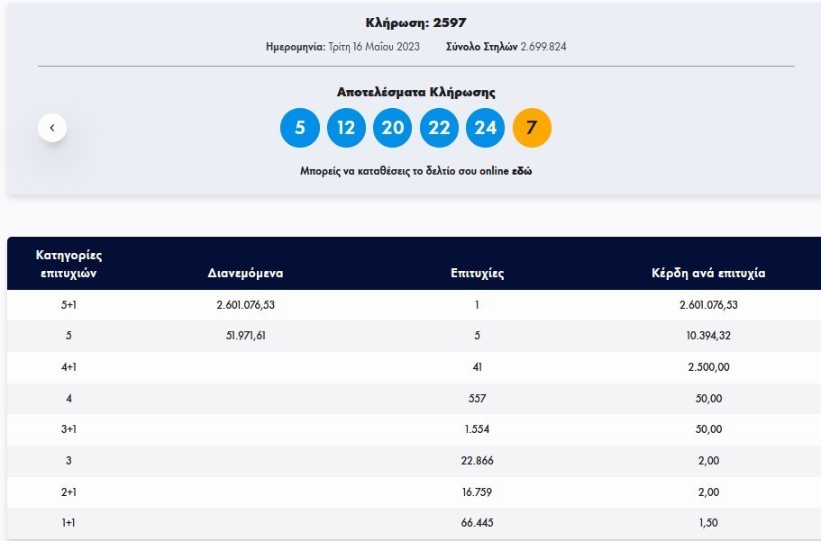 Oλοκληρώθηκε η κλήρωση του Τζόκερ που πραγματοποιήθηκε την Τρίτη, 16 Μαϊου 2023 και μοίραζε €2.500.000 στους νικητές της πρώτης κατηγορίας.