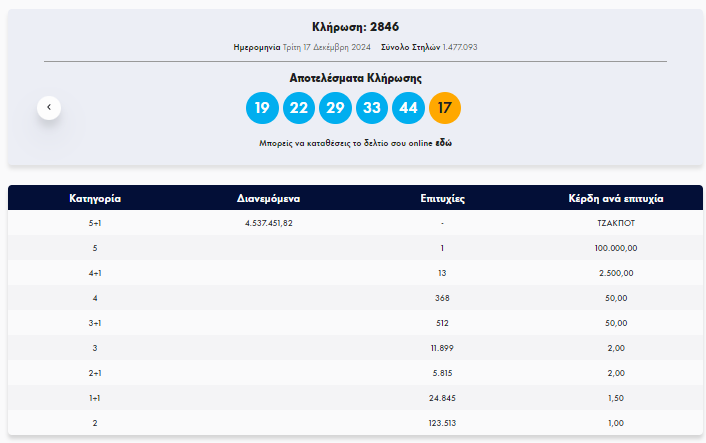 Oλοκληρώθηκε η κλήρωση του Τζόκερ που πραγματοποιήθηκε την Τρίτη, 17 Δεκεμβρίου, με κέρδη πάνω από 4,5 εκατ. ευρώ.