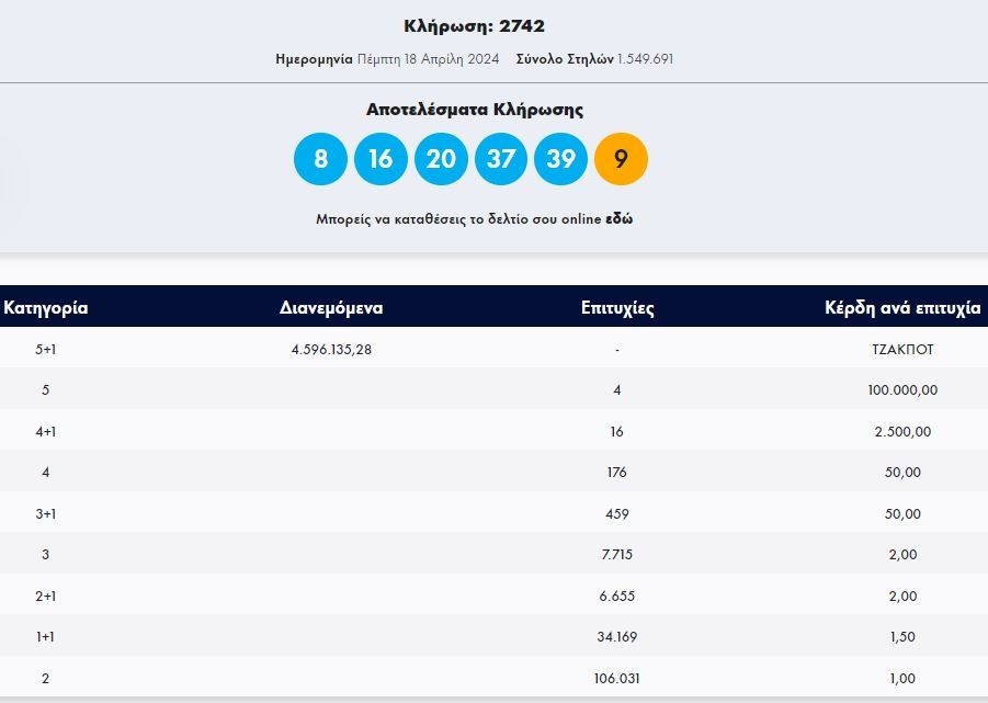 Oλοκληρώθηκε η κλήρωση 2742 του Τζόκερ που πραγματοποιήθηκε την Πέμπτη 18 Απριλίου 2024, με κέρδη πάνω από 4.500.000 ευρώ.