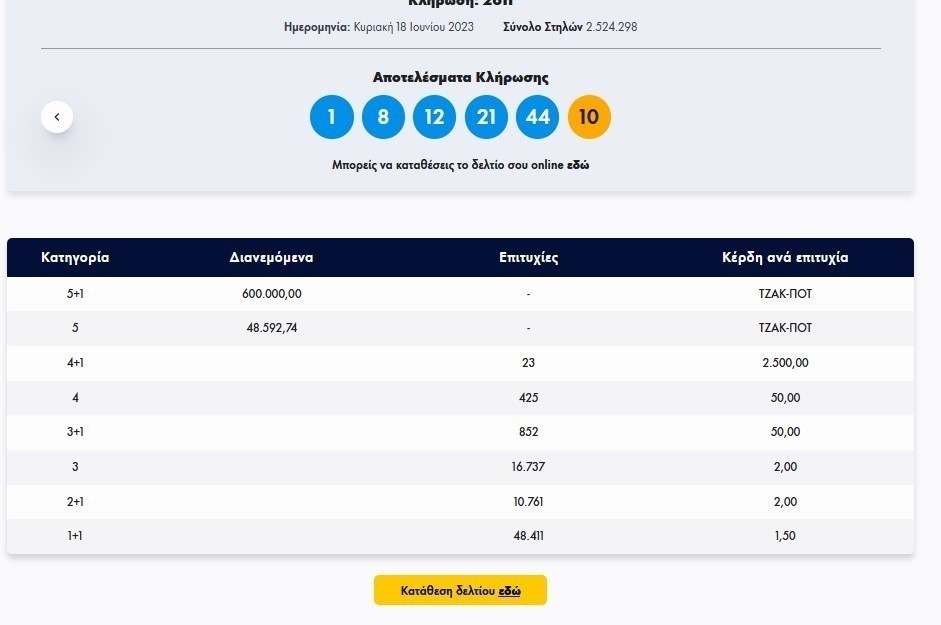 Oλοκληρώθηκε η κλήρωση του Τζόκερ που πραγματοποιήθηκε την Κυριακή, 18 Ιουνίου 2023 και μοίρασε €600.000 στους νικητές της πρώτης κατηγορίας.