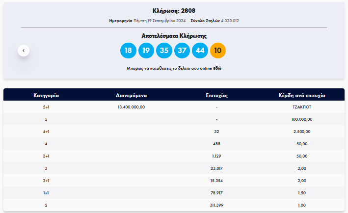 Οι τυχεροί αριθμοί στην κλήρωση Τζόκερ σήμερα είναι οι 18, 19, 35, 37, 44 και τζόκερ ο αριθμός 10.