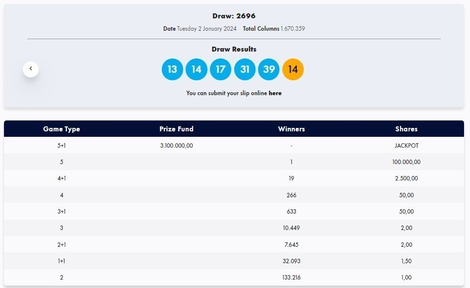 Oλοκληρώθηκε η κλήρωση του Τζόκερ που πραγματοποιήθηκε την Τρίτη, 2 Ιανουαρίου 2024, με κέρδη τουλάχιστον 3.100.000 ευρώ.