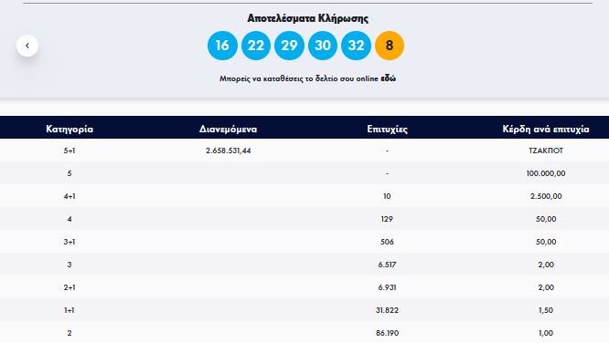 Οι τυχεροί αριθμοί στην κλήρωση Τζόκερ σήμερα είναι: 16, 22, 29, 30, 32 και τζόκερ ο αριθμός 8.