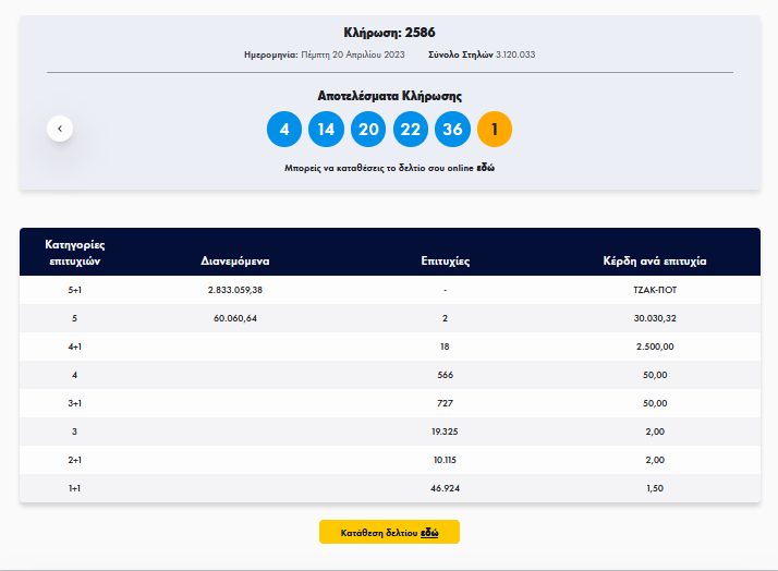 Oλοκληρώθηκε η κλήρωση του Τζόκερ που πραγματοποιήθηκε την Τρίτη, 20 Απριλίου 2023 και μοίραζε €2.800.000 στους νικητές της πρώτης κατηγορίας. Σημειώθηκε τζακ ποτ στην πρώτη κατηγορία.