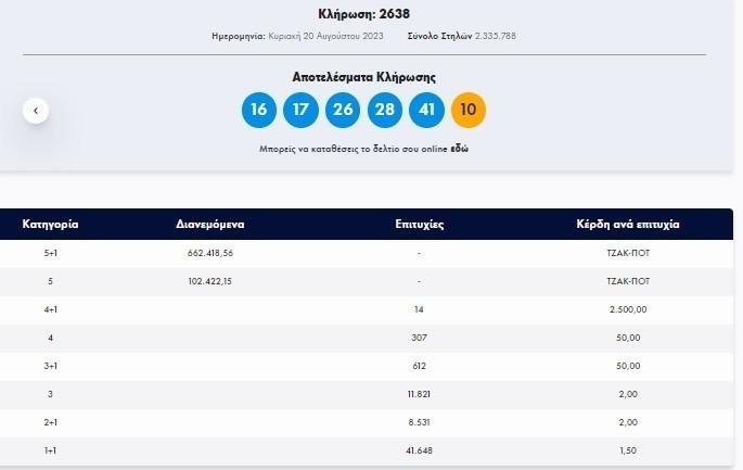 Oλοκληρώθηκε η κλήρωση του Τζόκερ που πραγματοποιήθηκε την Κυριακή 20 Αυγούστου 2023, με κέρδη 600.000 ευρώ στους νικητές της πρώτης κατηγορίας.