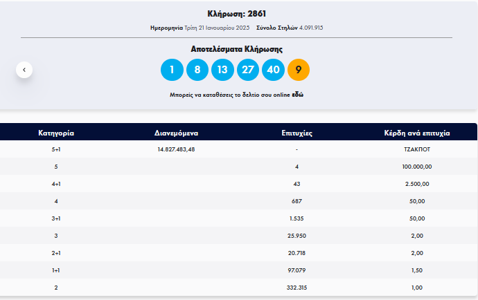 Οι τυχεροί αριθμοί στην κλήρωση Τζόκερ σήμερα είναι: 1, 8, 13, 27, 40 και τζόκερ ο αριθμός 9.