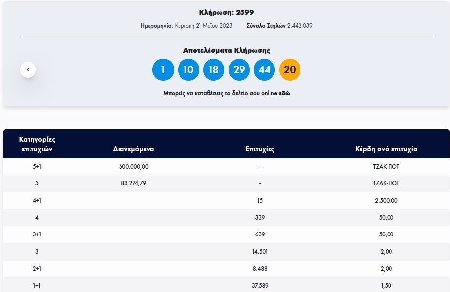 Oλοκληρώθηκε η κλήρωση του Τζόκερ που πραγματοποιήθηκε την Κυριακή, 21 Μαϊου 2023 και μοίραζε €600.000 στους νικητές της πρώτης κατηγορίας.