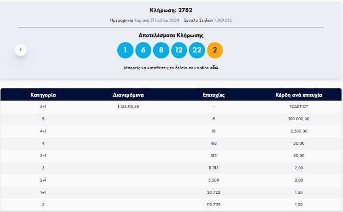 Oλοκληρώθηκε η κλήρωση του Τζόκερ που πραγματοποιήθηκε την Κυριακή, 21 Ιουλίου 2024, με κέρδη πάνω από 1 εκατ. ευρώ.