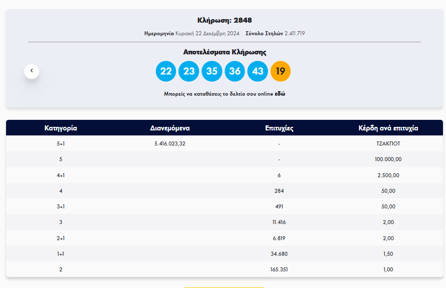 Oλοκληρώθηκε η κλήρωση του Τζόκερ που πραγματοποιήθηκε την Κυριακή, 22 Δεκεμβρίου, με κέρδη πάνω από 5,3 εκατ. ευρώ.