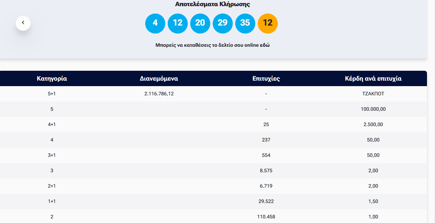 Στην πρώτη κατηγορία σημειώθηκε νέο τζάκποτ! Για αυτό και στην επόμενη κλήρωση, οι παίχτες θα διεκδικήσουν ποσό άνω των 2,3 εκατ. ευρώ.