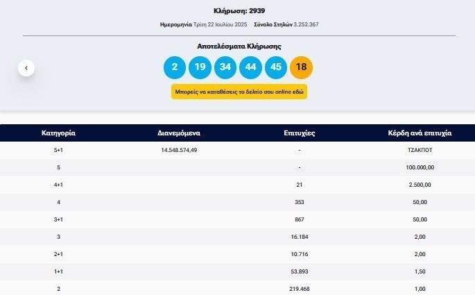 Ολοκληρώθηκε η κλήρωση του τζόκερ που πραγματοποιήθηκε την Τρίτη, 22 Ιουλίου, με κέρδη πάνω από 14,5 εκατ. ευρώ.