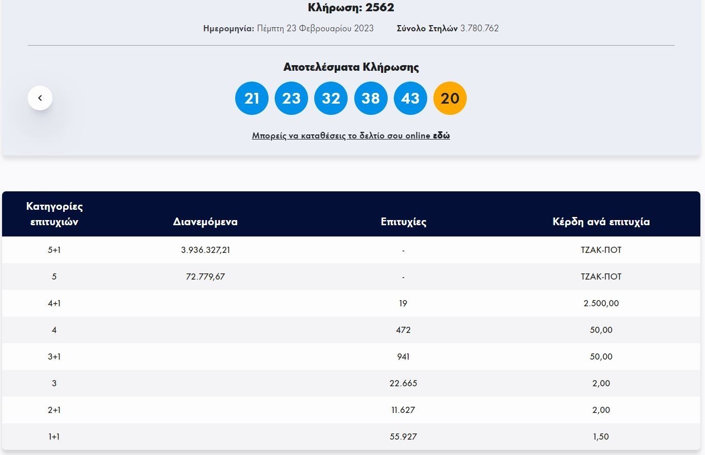 Ολοκληρώθηκε η κλήρωση (2562) του Τζόκερ που πραγματοποιήθηκε την Πέμπτη 23 Φεβρουαρίου 2023 και μοίραζε 3.936.327,21 εκατομμύρια ευρώ στους νικητές της πρώτης κατηγορίας.
