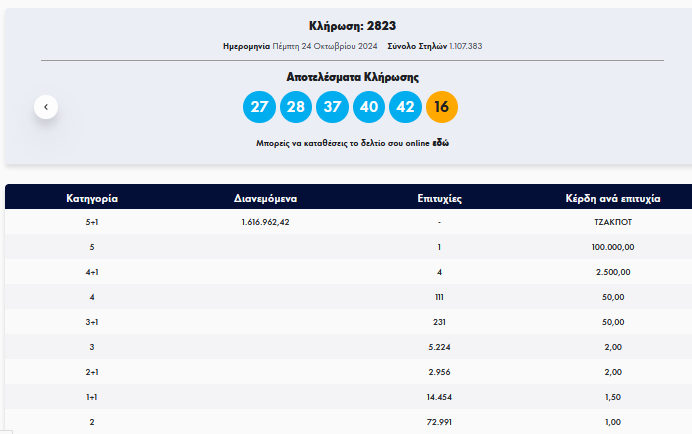 Oλοκληρώθηκε η κλήρωση του Τζόκερ που πραγματοποιήθηκε την Πέμπτη, 24 Οκτωβρίου, με κέρδη πάνω από 1,6 εκατ. ευρώ.