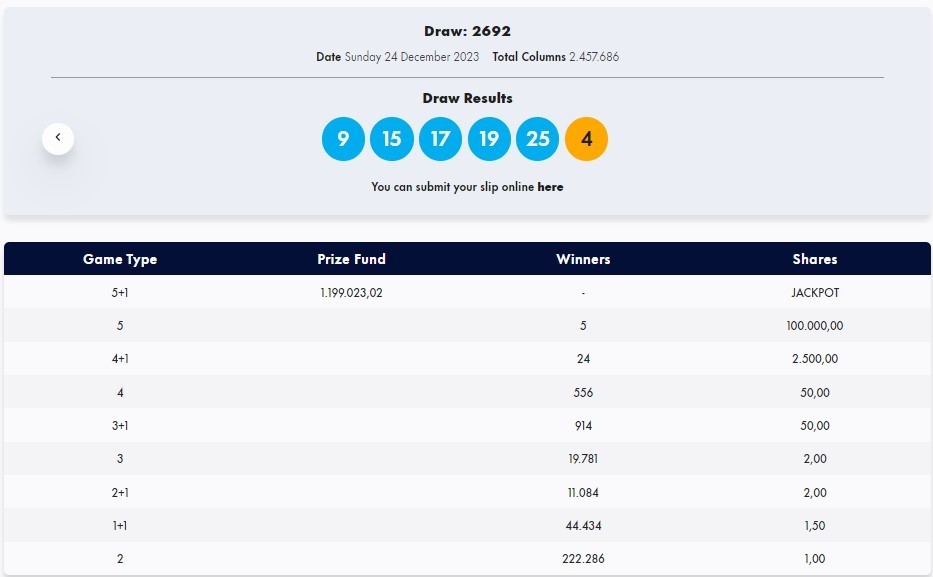 Oλοκληρώθηκε η κλήρωση του Τζόκερ που πραγματοποιήθηκε την Κυριακή, 24 Δεκεμβρίου 2023, με κέρδη τουλάχιστον 1.100.000 ευρώ.