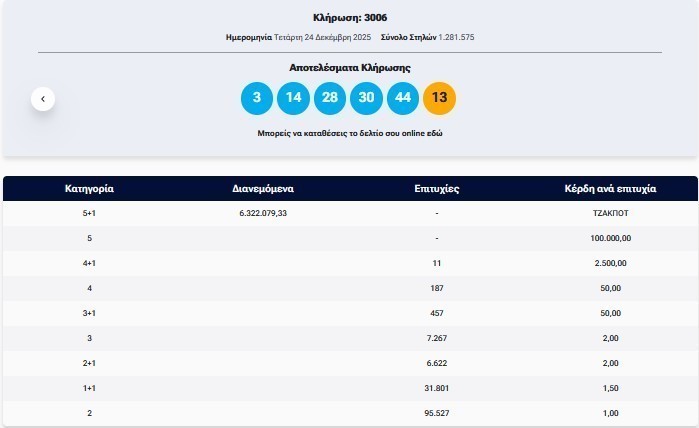 Ολοκληρώθηκε η κλήρωση του τζόκερ που πραγματοποιήθηκε την Πέμπτη, 24 Δεκεμβρίου, με κέρδη πάνω από 6,3 εκατ. ευρώ.