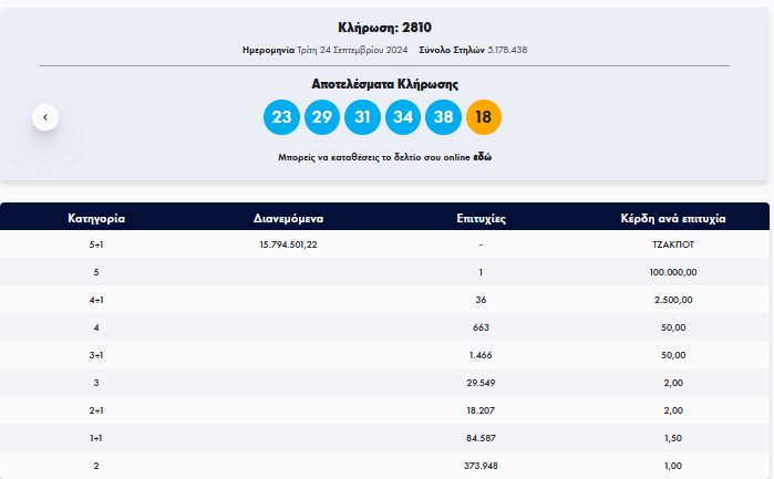 Οι τυχεροί αριθμοί στην κλήρωση Τζόκερ σήμερα είναι οι 23, 29, 31, 34, 38 και τζόκερ ο αριθμός 18.