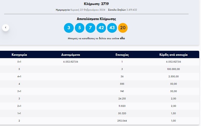 Oλοκληρώθηκε η κλήρωση 2719 του Τζόκερ που πραγματοποιήθηκε την Κυριακή 25 Φεβρουαρίου 2024, με κέρδη τουλάχιστον 6.500.000 ευρώ.