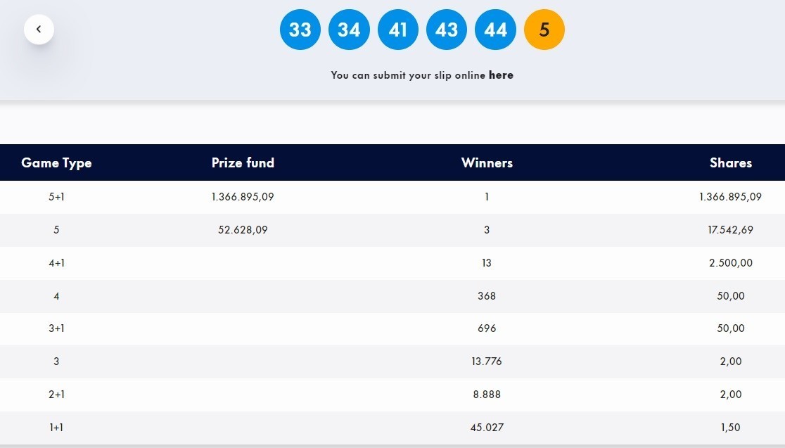 Οι τυχεροί αριθμοί σε αυτή την κλήρωση Τζόκερ είναι οι 33, 34, 41, 43, 44 και Τζόκερ ο αριθμός 5.