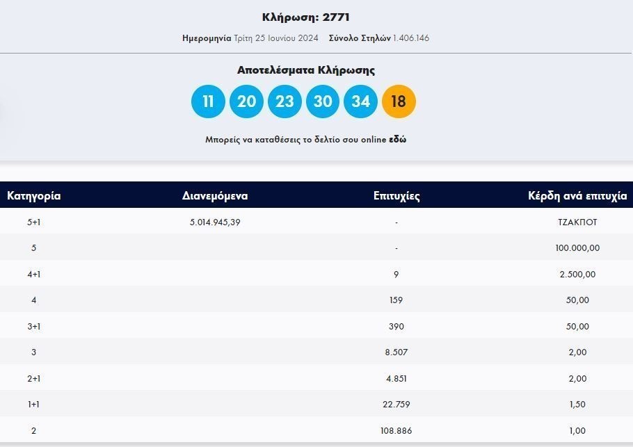 Oλοκληρώθηκε η κλήρωση 2771 του Τζόκερ που πραγματοποιήθηκε την Τρίτη 25 Ιουνίου 2024, με κέρδη πάνω από 5.000.000 ευρώ.