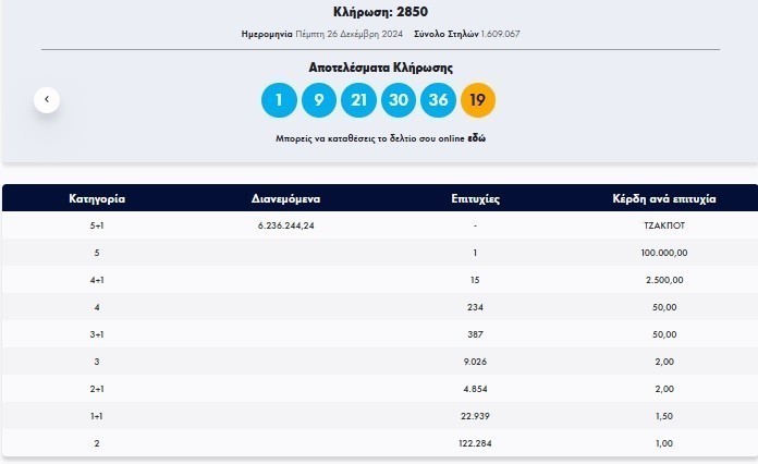 Oλοκληρώθηκε η κλήρωση του Τζόκερ που πραγματοποιήθηκε την Πέμπτη, 26 Δεκεμβρίου, με κέρδη πάνω από 5,8 εκατ. ευρώ.