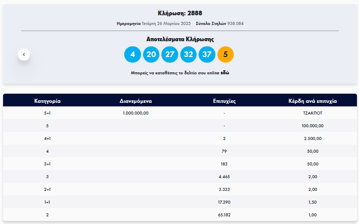 Oλοκληρώθηκε η κλήρωση του Τζόκερ που πραγματοποιήθηκε την Κυριακή, 26 Μαρτίου, με κέρδη 1 εκατ. ευρώ.