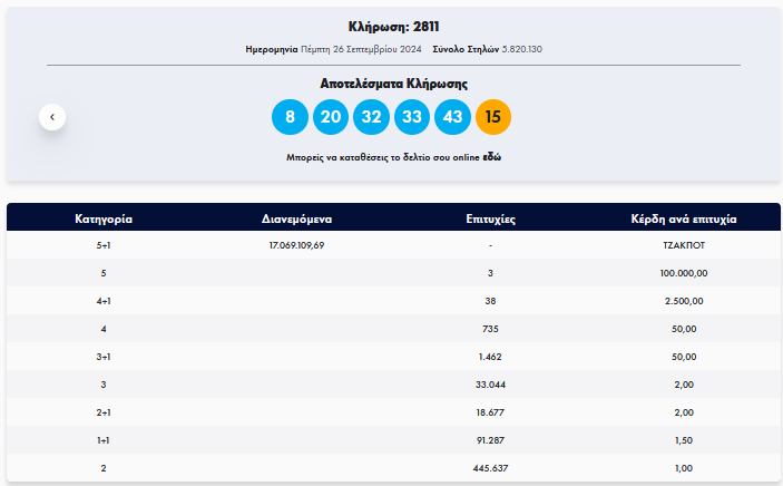 Οι τυχεροί αριθμοί στην κλήρωση Τζόκερ σήμερα είναι οι 8, 20, 32, 33, 43 και τζόκερ ο αριθμός 15.