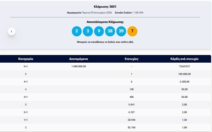 Ολοκληρώθηκε η κλήρωση του τζόκερ που πραγματοποιήθηκε σήμερα Πέμπτη, 29 Ιανουαρίου, με κέρδη 1 εκατ. ευρώ.
