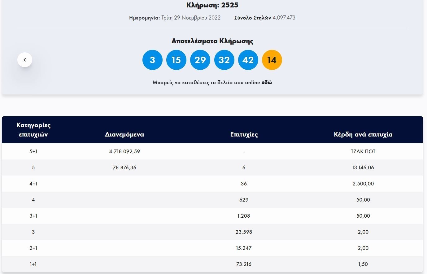 Οι τυχεροί αριθμοί που έβγαλε η κληρωτίδα είναι οι: 3, 15, 29, 32, 42