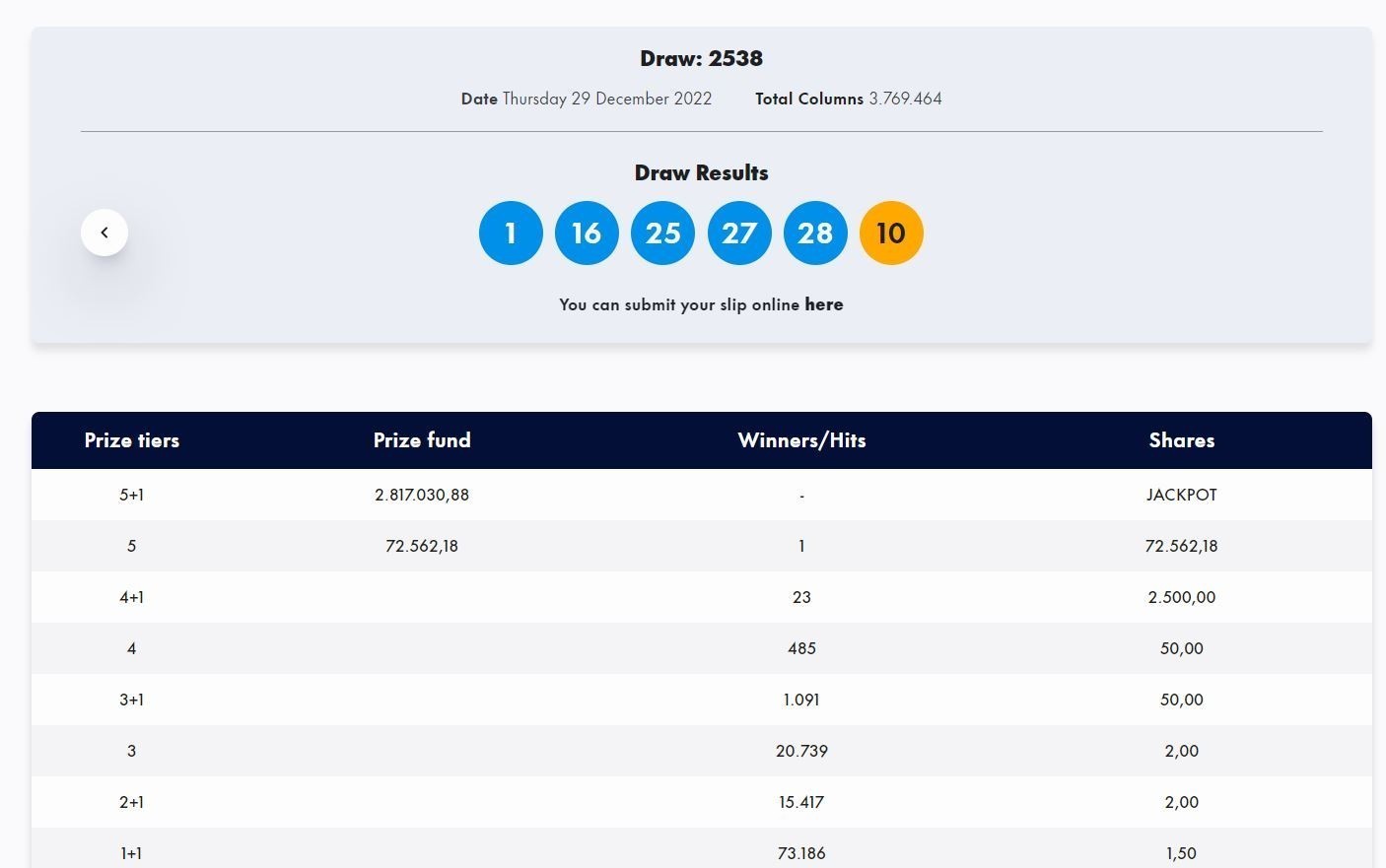Ολοκληρώθηκε η κλήρωση (2538) του Τζόκερ, που πραγματοποιήθηκε την Πέμπτη 29 Δεκεμβρίου 2022 και μοίραζε περισσότερα από 2.800.000 ευρώ, έπειτα από τα συνεχιζόμενα τζακ ποτ.